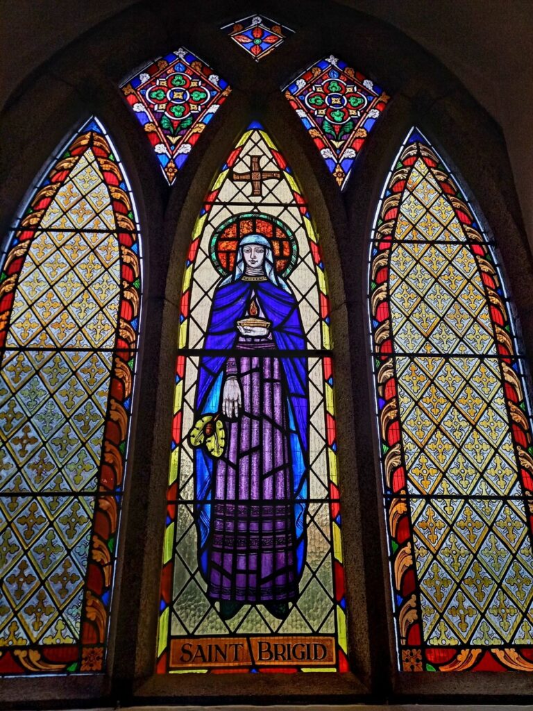 St. Brigid is associated with fire. When she was a baby neighbors saw the house was in on fire. They ran to it, fearful that the babe had perished in the blaze. However, the house was just aglow and she was unharmed. This miracle was a sign that she was favored by God. She is also connected to an eternal flame. At her duel monastery (both men and women) she and nineteen virgins tended a flame. After her death the fire needed no tending on her assigned night. The fire continued perpetually until the 13th century when it was extinguished. It was soon relit and continued until the time of the Reformation when it was put out. In 1993 the tradition was renewed by the Brigidine Sisters and continues on today. (Note the flame in the depiction on the stained glass window below.)