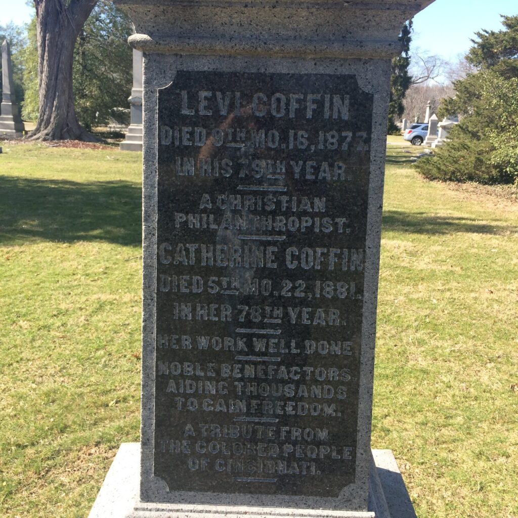 Coffin died on September 16, 1877, at around 6:30 p.m. at his home in Avondale, Ohio. His funeral was held at the Friends Meeting House of Cincinnati. The Cincinnati Daily Gazette reported that the crowd was too large to be accommodated indoors; hundreds had to remain outside. Four of Coffin’s eight pallbearers were free blacks who had worked with him on the Underground Railroad. Coffin was interred in Cincinnati’s Spring Grove Cemetery in an unmarked grave.[48] Coffin’s wife, Catherine, who died four years later on May 22, 1881, is buried in Spring Grove Cemetery as well.[49]